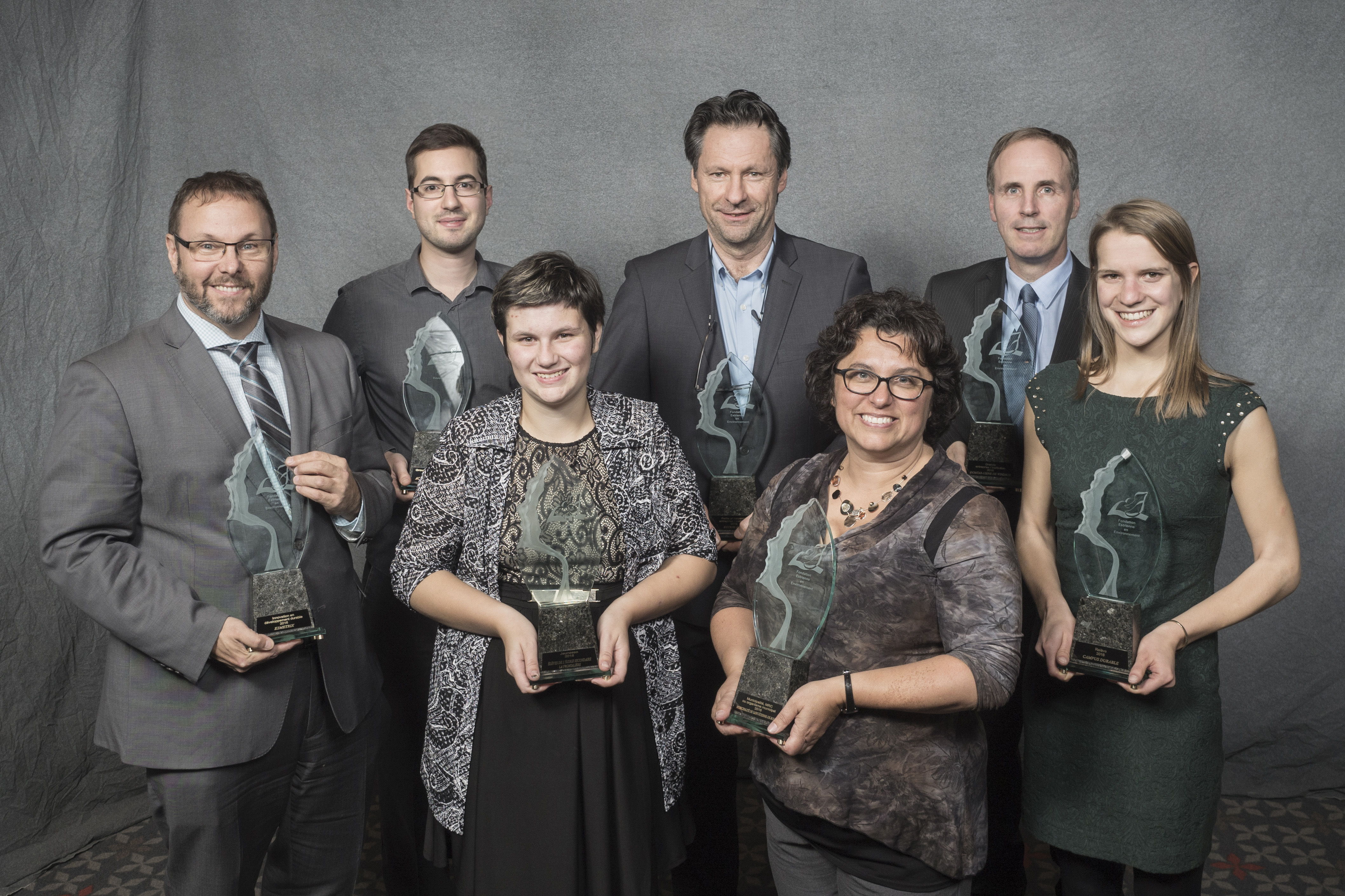 (de gauche à droite) Tom Whitton – E2Metrix, François Lauzon – Action Saint-François, Marie-Ève Chaperon – École secondaire La Frontalière, Claude Belleau – Estrie Aide, Hélène Vincent – St-Étienne-de-Bolton, André Gravel – Domtar, Anne-Catherine Pilon – Campus durable